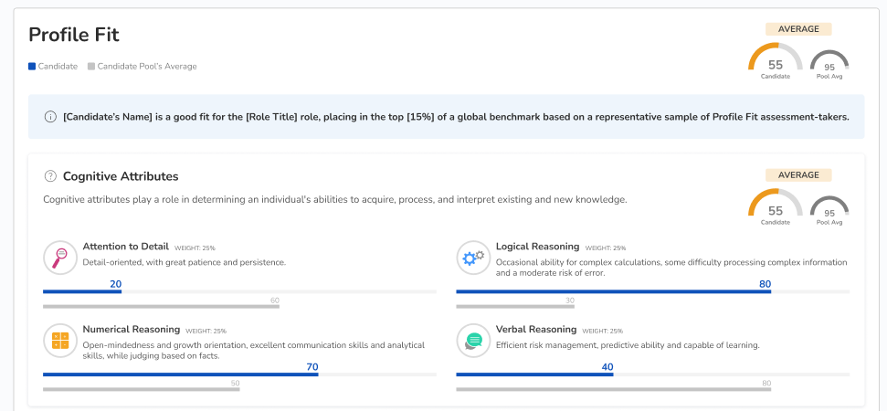 The Profile Fit section offers psychometric insights into how well a candidate’s abilities and behavioral tendencies align with the demands of the role.