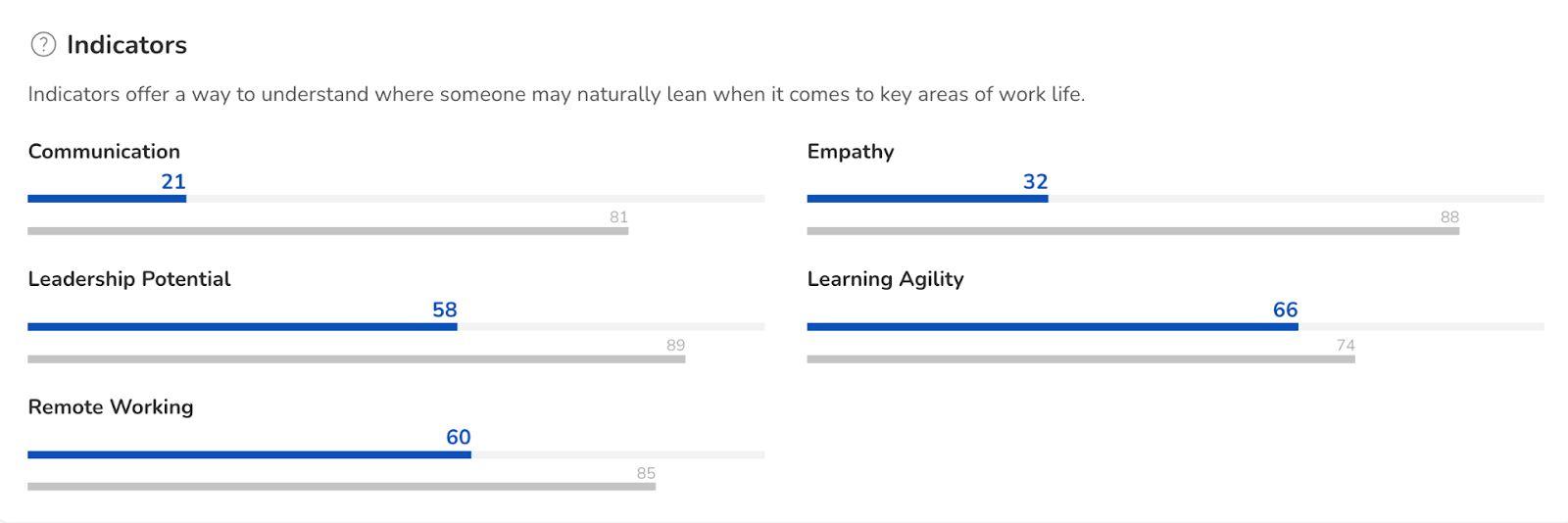 Following the Personality Traits section, the Indicators scores assessed by the Profile Fit are displayed using bar charts (blue = candidate, grey = candidate’s pool average) to quickly assess alignment with key success factors across the role.
