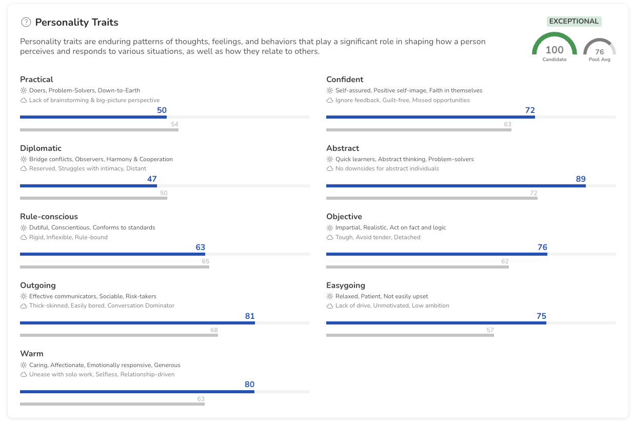 This part of the results highlights how a candidate scores on selected traits most relevant for success in the role. Traits are displayed with a focus on the preferred end of each scale (e.g., “practical”).