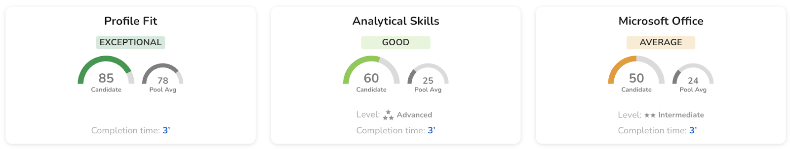 This section is ideal for quickly comparing overall candidate performance and identifying standout strengths or red flags across assessments.