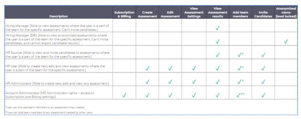 Able to view anonymized assessments where the user is a part of the team for the specific assessment. Can't invite candidates, and cannot export candidate results.