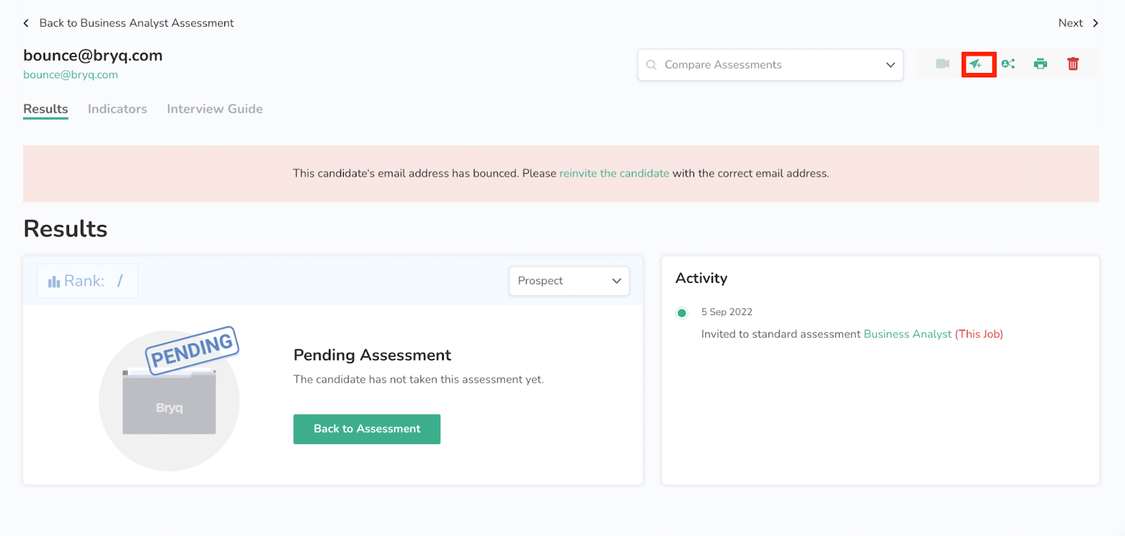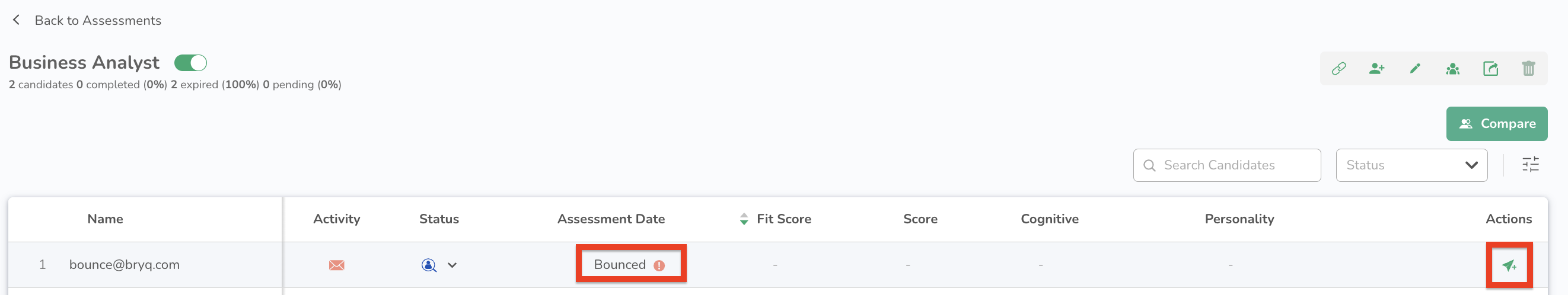 All bounced invitations will also appear in your assessment list. You can re-invite candidates through here as well.