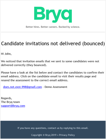 If an assessment is sent to a candidate's wrong email address, you will receive an email notifying you. The notification will indicate the email account that bounced and the assessment it is related to. If multiple addresses bounce during approximately the same time, your email notification may contain multiple candidates.