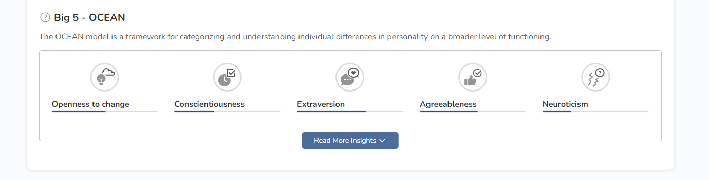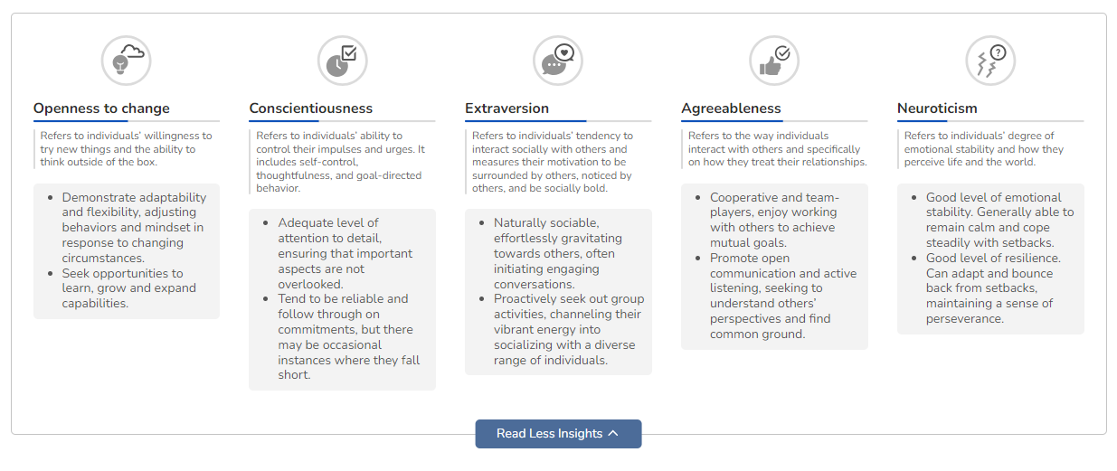 Clicking on the Read More Insights button, a detailed description of the talent's personality as per the Five-Factor model is displayed together with an explanation of each dimension: