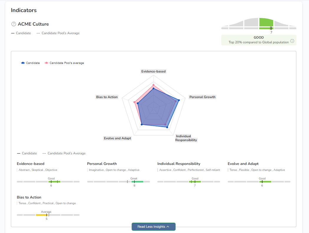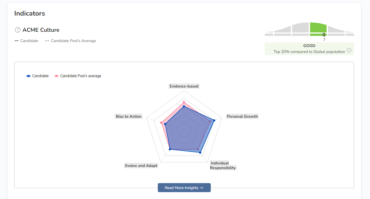 At the bottom of the spider chart, there is a Read More Insights button, where you have the option to view the mapping of each value and how the candidate performs per value.