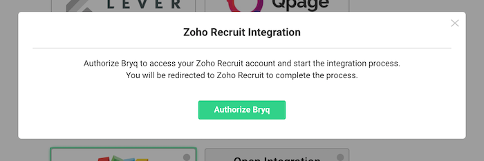 2. Once there, click on the Zoho Recruit logo. Then click Authorize Bryq.
