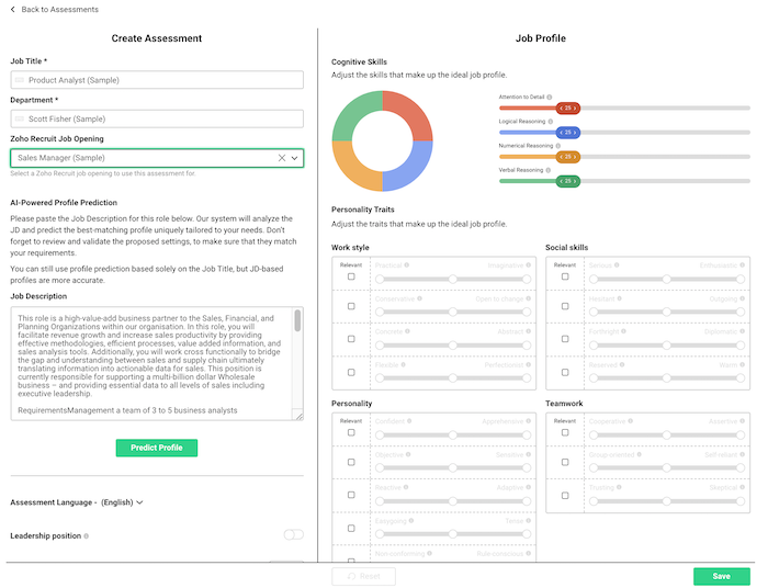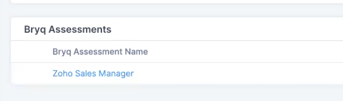 Go to your Bryq account and either create a new assessment or pick one you have already made. With the Integration, you will now be able to use the Zoho drop-down menu to pick one of your Zoho jobs. The information on the job profile will automatically fill. All you have to do is click Save.