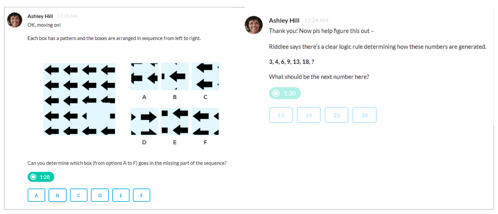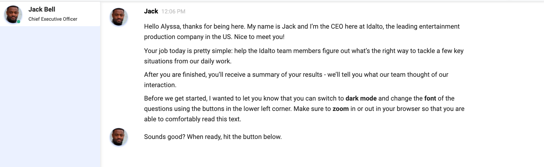 During this 20 minute, interactive chat-bot assessment, candidates will be taken through a day of work at Idalto Ltd., an events company. Candidates will help various department heads, including the Chief Executive Officer, Senior Director, Productions, Chief Financial Officer, complete a variety of tasks in areas such as design, finance, business, logistics, and more. There is also a hefty mix of personality-based questions included as well.
