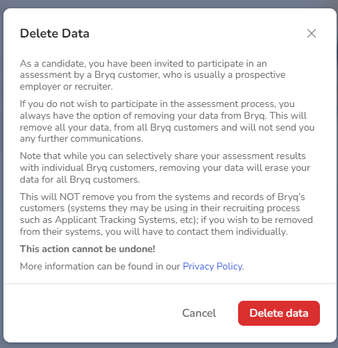 For any reason, candidates can delete themselves from the Bryq database. They can do this by reaching out to Bryq and requesting the link to delete their account.