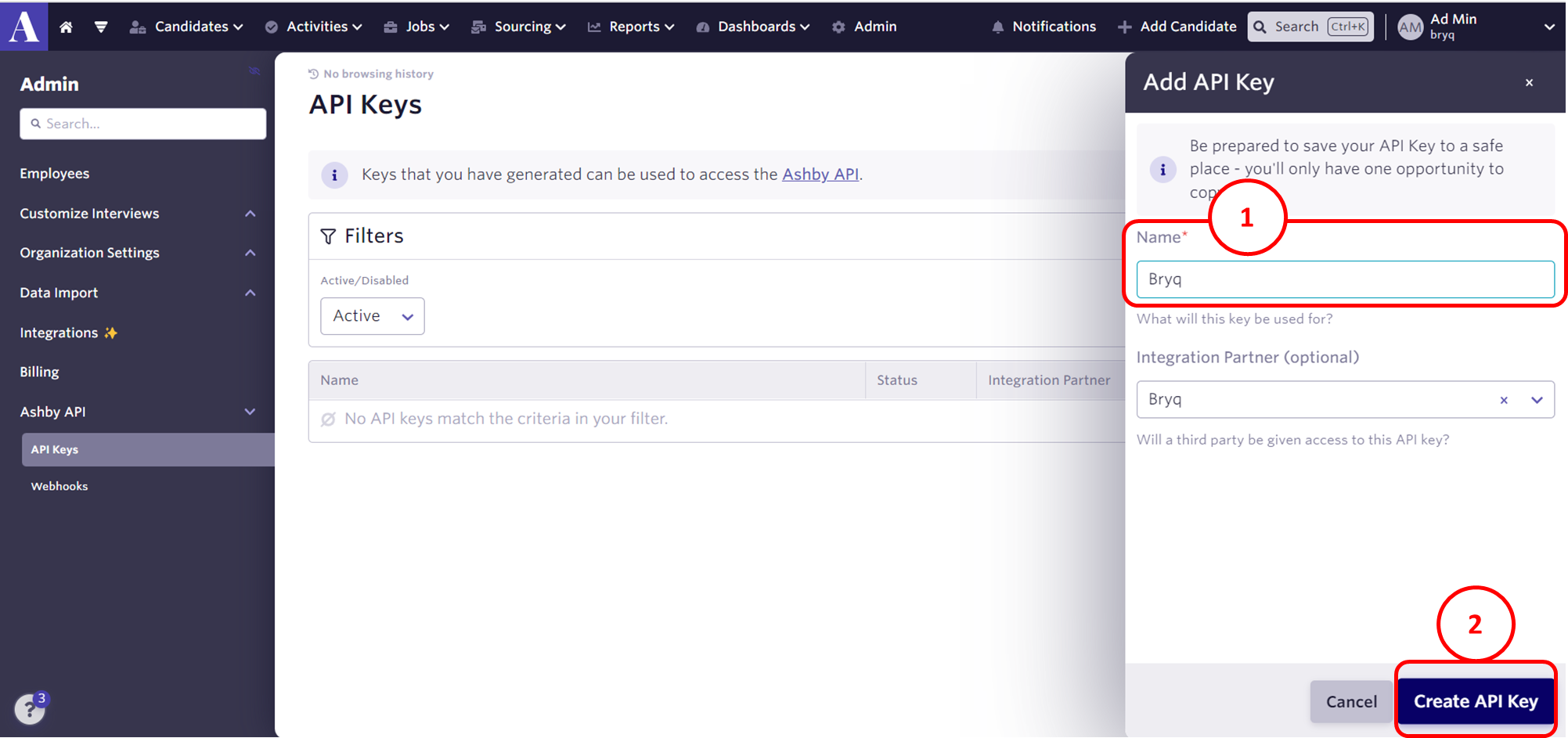 7. Then you should copy the Bryq API key and go to https://app.ashbyhq.com/admin/integrations/marketplace/bryq