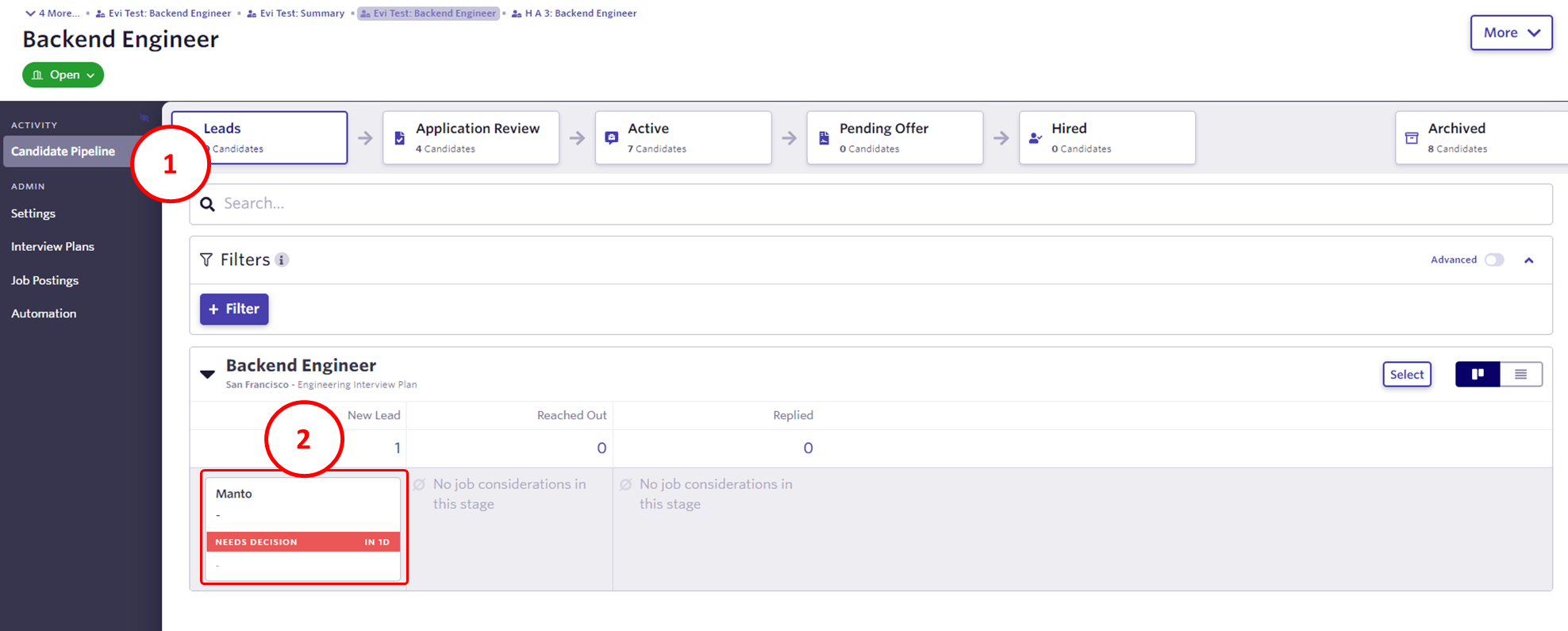 2. From the Candidate Pipeline page, select a candidate from the pipeline Stage. (i.e. Leads)