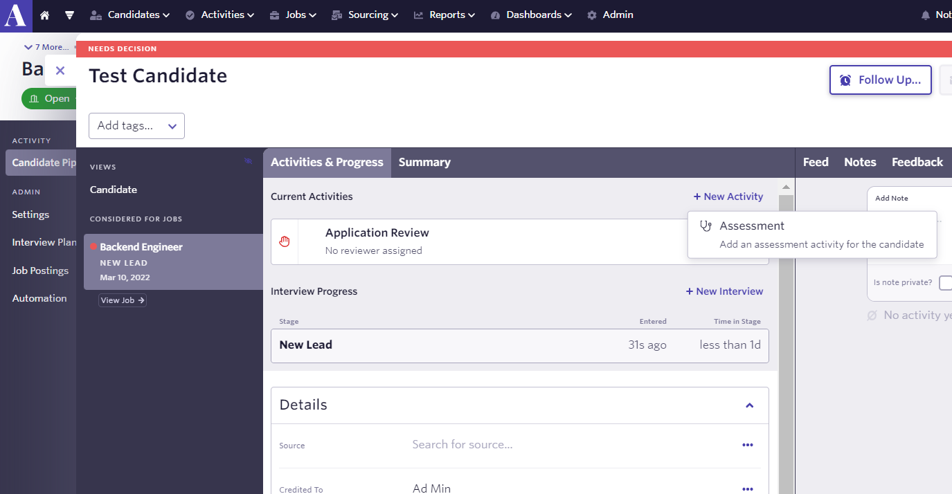 3. Once accessing the Candidate view, you can click on "New Activity" to assign an assessment to the candidate.