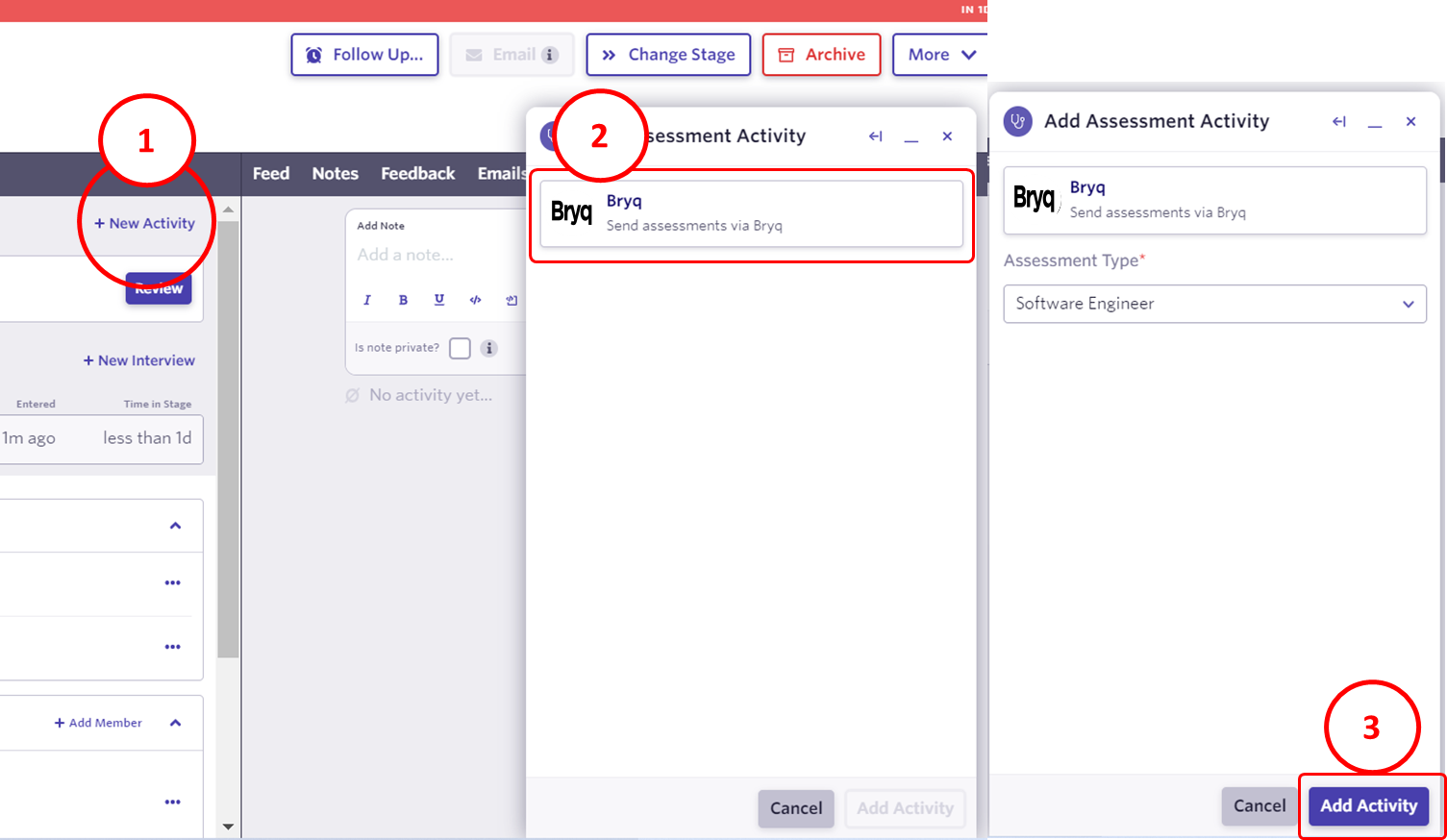 Once the Ashby/Bryq integration is enabled for your organization, you will be able to add the Bryq assessment after selecting a candidate.