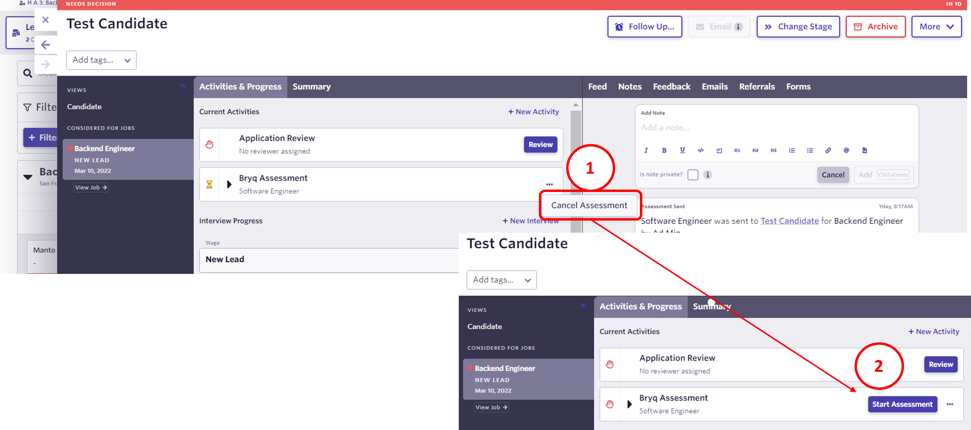 Once an assessment is sent to the candidate, it can be cancelled via Ashby by clicking the Cancel Assessment button. Once the assessment is cancelled, you may re-send it to the candidate by clicking the Start Assessment button.