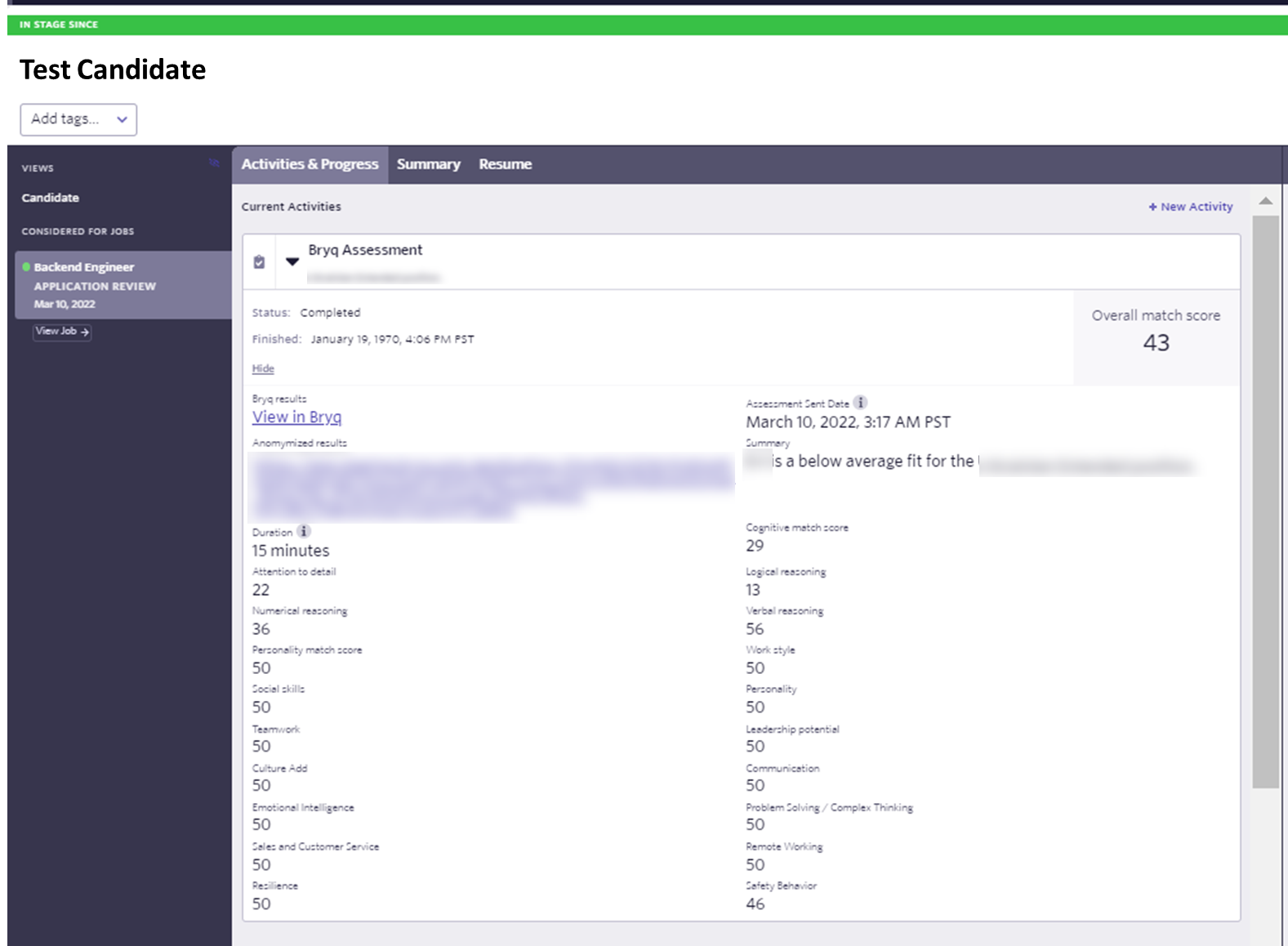 1. Once an Assessment is completed, the scores are listed below the "Bryq Assessment" activity. The score is the overall match of the candidate, which is composed of the Cognitive Match and Personality Match scores. You are also shown the details of the Cognitive scores. If indicators are active, the results will also be shown. The results are much easier to read if you click on the View in Bryq link.