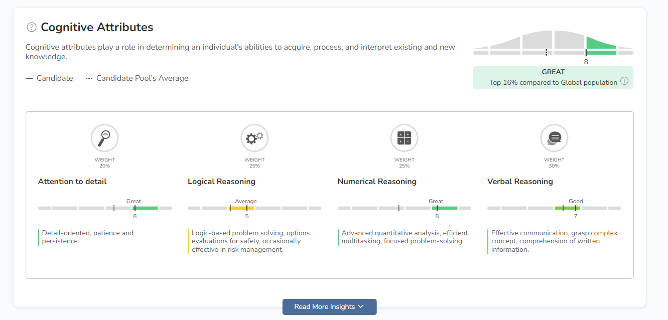 📍Note: The assessment of cognitive skills—verbal, numerical, logical reasoning, and attention to detail—differs significantly from IQ tests. While IQ tests measure overall intelligence and cognitive potential across a broad range, our cognitive assessment specifically targets reasoning skills and attention capabilities relevant to job-related problem-solving and decision-making. This evaluation does not provide a comprehensive measure of intelligence; instead, it evaluates specific skills critical for success in targeted tasks or jobs.