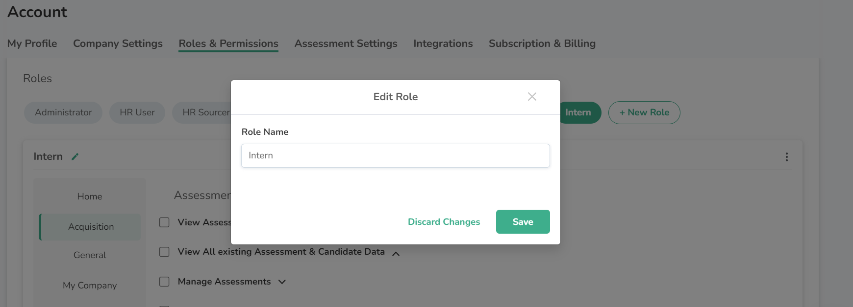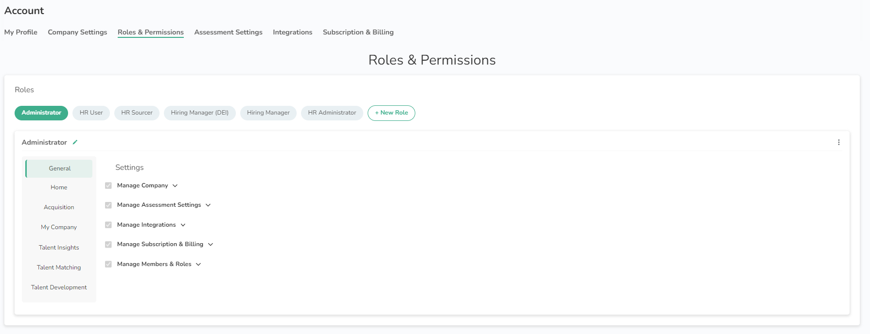 โ ๏ธEvery hiring role that should have access to all candidate data should have Acquisitions > Assessments > View All existing Assessment & Candidate Data enabled. In any other case the user views Assessment & Candidate data only from assessments that he/she is a member of. |