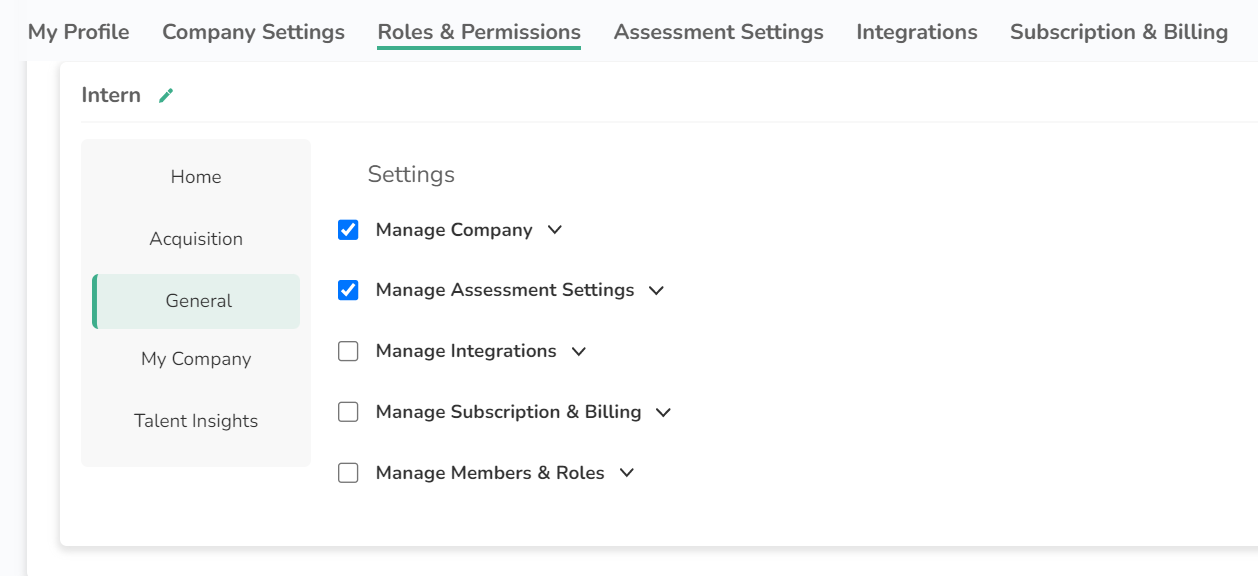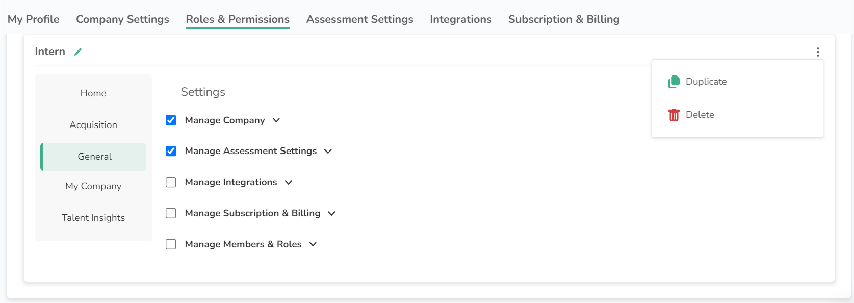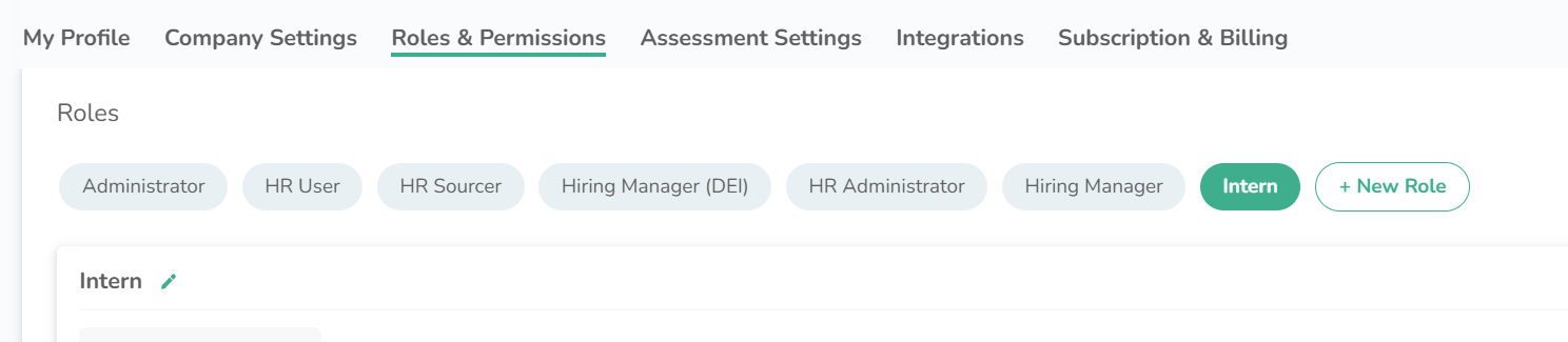 Establish which team members have access to which parts of your hiring process with hiring roles. First access the menu Roles & Permissions from the Profile icon from the top bar on your right.