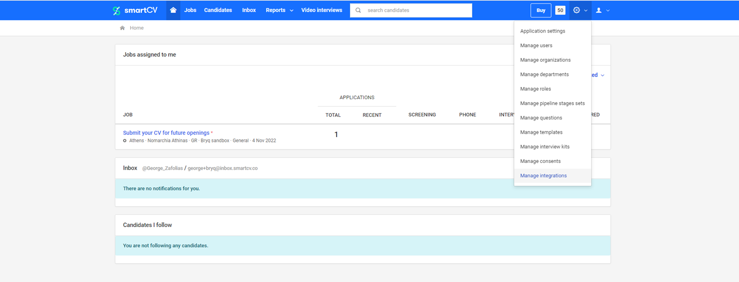 4. Go to your SmartCV account and head to the Manage Integrations menu.