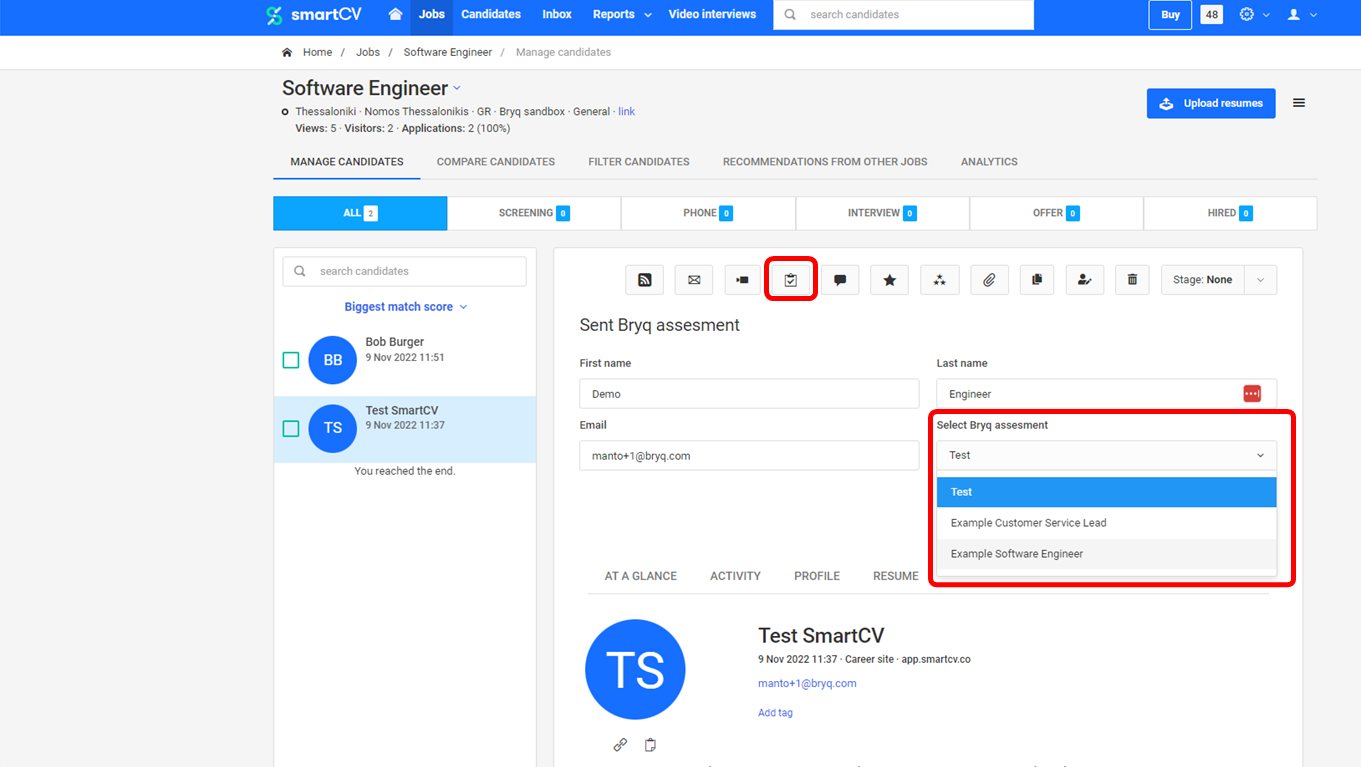 Select a job and then an applicant. You can then decide to send the Bryq assessment by clicking at the relevant Sent Bryq Assessment button from the list of actions.
