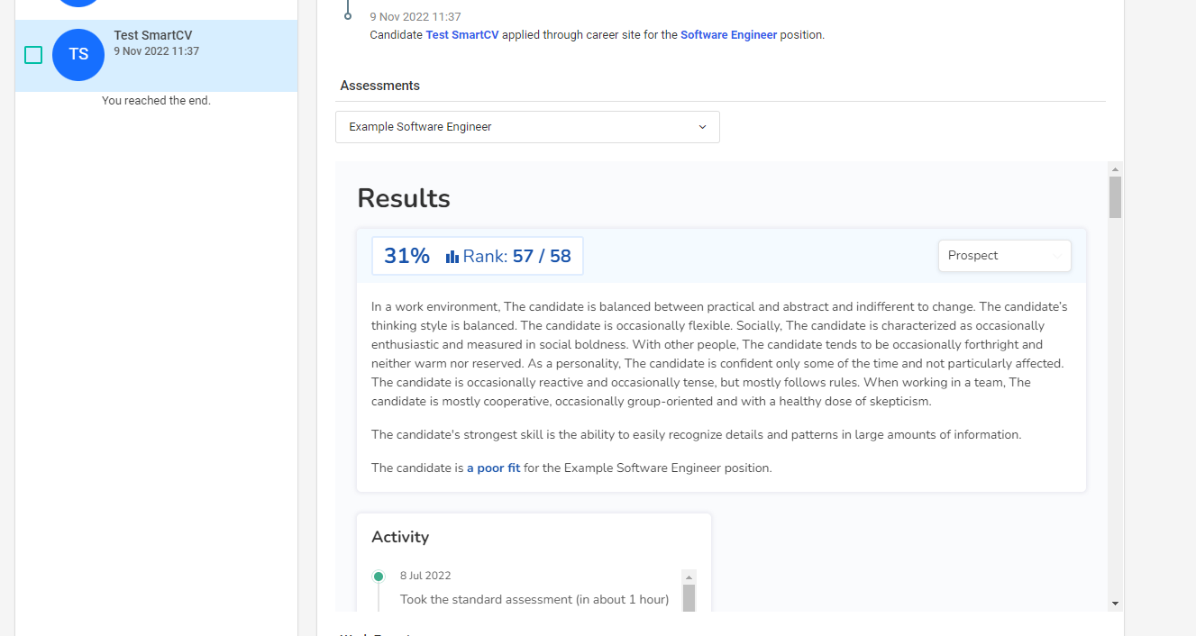Once a candidate has completed the assessment you can access SmartCV and view the anonymized candidate results link powered by Bryq right under the Activity Section.