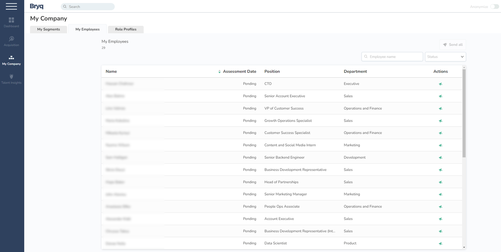 Now that you have all your Employees parsed into Bryq (HOW TO), you can invite them to take the Bryq assessment. There are two possible ways of doing so.