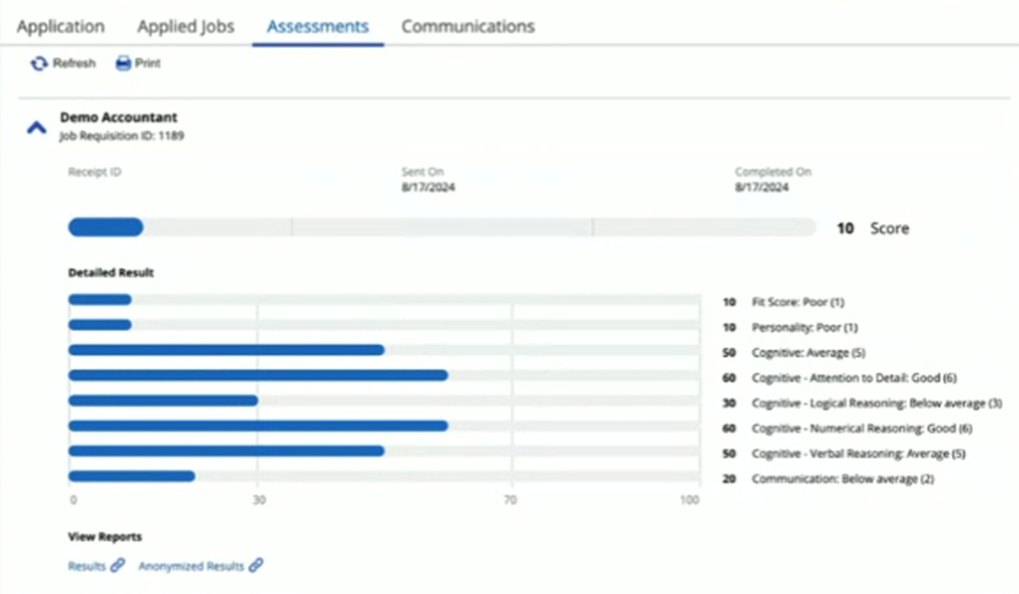 If the candidate has completed one or more assessments as part of their job application, Dayforce displays the results in the Assessments tab in their job application profile. You can click the title of each assessment to view the details:
