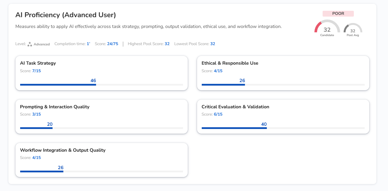 Is this assessment specific to any AI tool? No. The assessment is tool-agnostic. It measures how a candidate reasons about and works with AI, regardless of which specific tools they use.